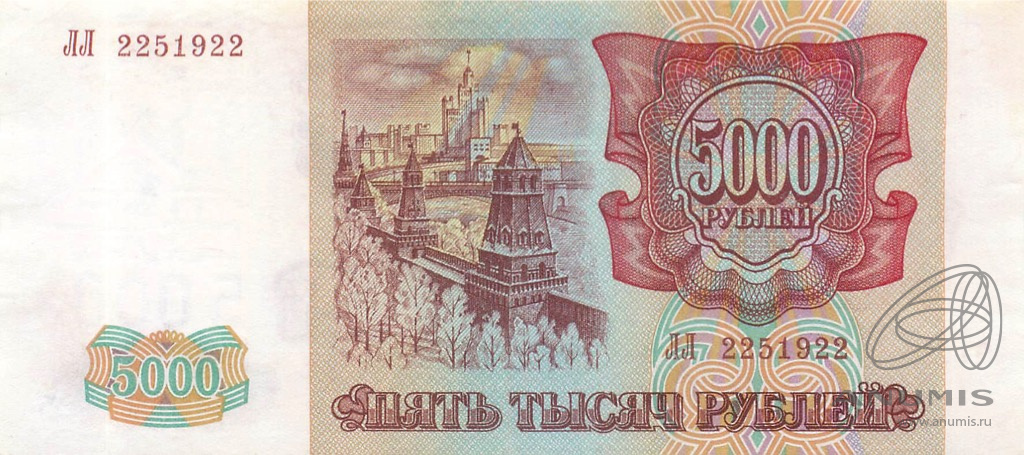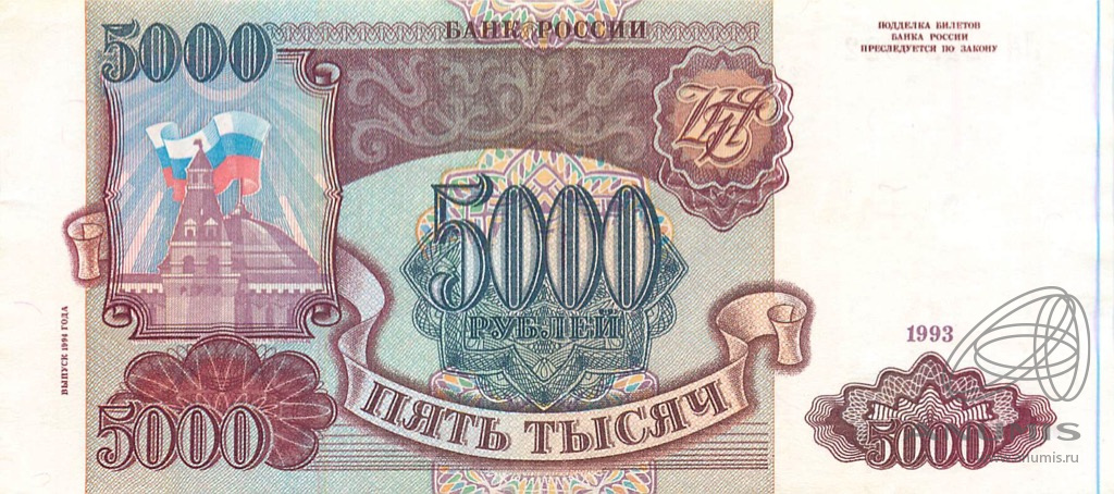Банкнота регулярного выпуска: 5000 рублей 1994 года «обр. 1993». Билеты Банка России 1994 г. Российская Федерация: Банк России (1992 — 1996).