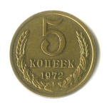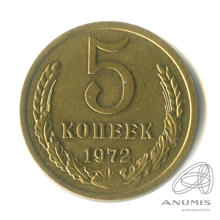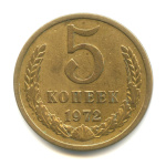 Монета регулярного выпуска: 5 копеек 1972 года. 5 копеек 1961 — 1991 гг. Союз Советских Социалистических Республик: СССР поздний (1961 — 1991). Латунь, 5 г, ø 25 мм, Гурт: Рубчатый.