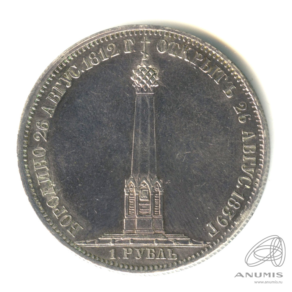 Юбилейная монета: 1 рубль 1839 года «Бородино. Открытие Бородинского памятника-часовни». 1 рубль 1839 г. «Бородино». Российская Империя: Николай I (1825 — 1855). Гравер: Генрих Игнатьевич Губе. Серебро 868, 21 г, ø 36 мм, Гурт: Рубчатый. Тираж: 160000 шт.