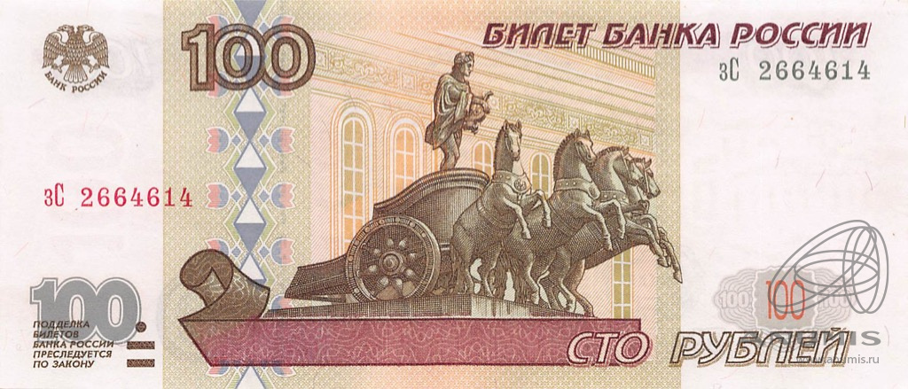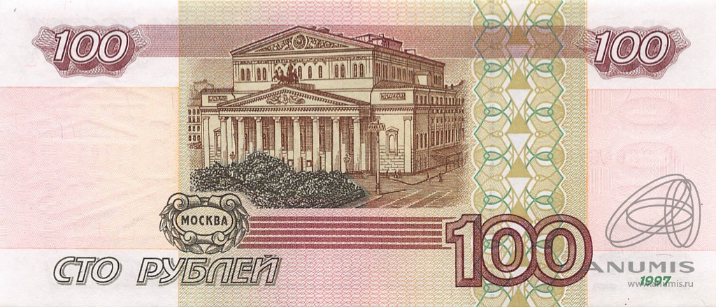 Банкнота регулярного выпуска: 100 рублей 1997 года. Билеты Банка России 1997 г. Российская Федерация: Россия современная (1997 — 2020).